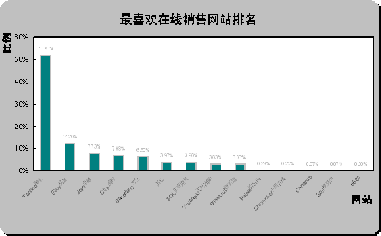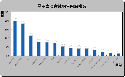 易趣中國(guó)和貝塔斯曼最不受歡迎。從最不喜歡在線銷(xiāo)售網(wǎng)站排名(如上圖)可以看出,易趣中國(guó)eBay