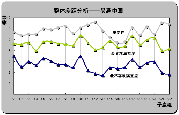 2) 重要流程欠缺最優(yōu)體驗(yàn)。雖然易趣中國(guó)被認(rèn)為是最不喜歡的在線銷(xiāo)售網(wǎng)站,但從滿意度評(píng)分也同時(shí)可以發(fā)現(xiàn),易趣中國(guó)在S1(瀏覽速度),S16(個(gè)人定制促銷(xiāo)信息的發(fā)布)和S15(個(gè)性化頁(yè)面設(shè)置)還是為用戶(hù)設(shè)計(jì)了相對(duì)較好的體驗(yàn)。但重要性得分排名前三位的子流程中,S12(產(chǎn)品質(zhì)量可靠)、S21(退換貨服務(wù))和S22(客戶(hù)投訴和反饋)仍為重要性與滿意度差距最大的三個(gè)子流程,易趣中國(guó)也未在重要流程上為用戶(hù)設(shè)計(jì)優(yōu)越的在線體驗(yàn)。