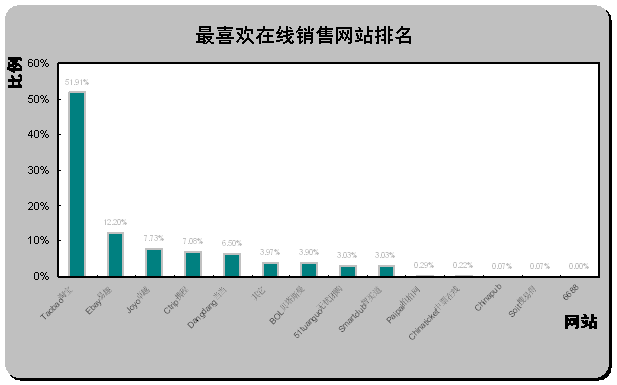 China和貝塔斯曼BOL成為“最不喜歡在線銷(xiāo)售網(wǎng)站”的前兩名,分別有19.77%和18.40%被調(diào)查者選擇易趣和貝塔斯曼作為“最不喜歡在線銷(xiāo)售網(wǎng)站”,兩家網(wǎng)站以相對(duì)較大的比例領(lǐng)先與其他各在線銷(xiāo)售網(wǎng)站。雖然淘寶以巨大的優(yōu)勢(shì)成為“最受歡迎的在線銷(xiāo)售網(wǎng)站”,但同時(shí)也可以發(fā)現(xiàn),仍有8.08%的被調(diào)查者選擇淘寶作為“最不喜歡在線銷(xiāo)售網(wǎng)站”,其它“最不喜歡在線銷(xiāo)售網(wǎng)站”比例相對(duì)較大的還有為當(dāng)當(dāng)(7.79%)。
