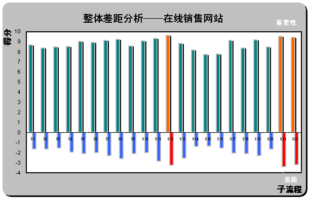 。2)整體差距分析(Gap Analysis)。請(qǐng)見(jiàn)上圖X軸下方所示,計(jì)算所有被調(diào)查對(duì)所列在線銷(xiāo)售網(wǎng)站的滿意度平均值(綜合最喜歡在線銷(xiāo)售網(wǎng)站和最不喜歡在線銷(xiāo)售網(wǎng)站的滿意度,計(jì)算被調(diào)查者對(duì)22個(gè)子流程的滿意度評(píng)分)。通過(guò)計(jì)算重要性和滿意度的差距,首先,一個(gè)有趣的現(xiàn)象,在著色的三個(gè)差距最大的子流程剛好也是重要性得分排名前三位的流程S12,
