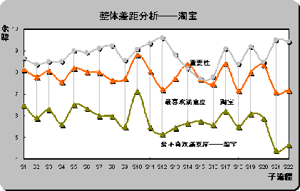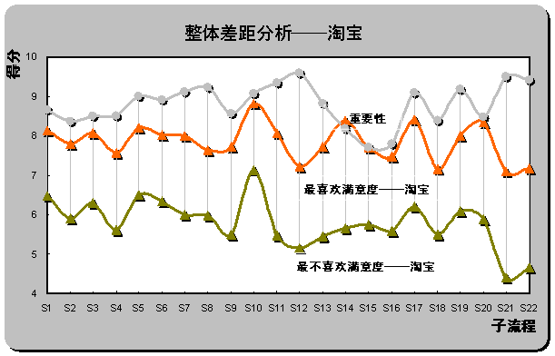 S12(產(chǎn)品質(zhì)量可靠)和S22(客戶(hù)投訴和反饋),具體差距分別為2.44,2.38和2.22。也是重要性評(píng)分排名前三位的子流程。雖然淘寶成為用戶(hù)最喜歡的在線銷(xiāo)售網(wǎng)站,但在重要子流程上并未為用戶(hù)設(shè)計(jì)最佳體驗(yàn)。