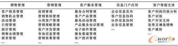 CRM應用系統(tǒng)功能平臺對應于平臺架構(gòu)中的應用功能層,是系統(tǒng)平臺的卞體部分。基于對A企業(yè)的需求分析及B/S的平臺架構(gòu)特點,筆者將系統(tǒng)功能綜合歸納為銷信管理、營銷管理、客戶服務管理、信息門戶應用及客戶智能支持5大模塊,它們共同構(gòu)成的系統(tǒng)的功能平臺如圖2所示,詳細功能設(shè)計如表1所示。