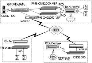 根據(jù)實際的話務(wù)量和人員數(shù)量,選用FXO接口2-8路語音的CNG2000 IP語音網(wǎng)關(guān)1臺。可以選用PBX應(yīng)用方式或向電信公司申請Centrex業(yè)務(wù)。
