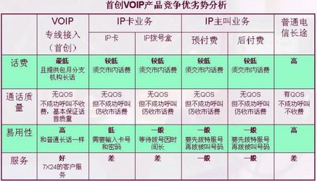 比業(yè)內(nèi)其他多種IP電話更具價格優(yōu)勢。每個長途呼叫無論是否建立成功,都不收取本地市話費用。對于國內(nèi)目前話務(wù)量集中的國際間通信,采用的資費標(biāo)準相對其他運營商具有價格優(yōu)勢。對于企業(yè)的Intranet Call,由于企業(yè)間不產(chǎn)生話費,更能夠節(jié)省大量的話務(wù)開支。