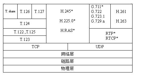 H.323是國(guó)際電信聯(lián)盟(ITU)的一個(gè)標(biāo)準(zhǔn)協(xié)議棧,該協(xié)議棧是一個(gè)有機(jī)的整體,根據(jù)功能可以將其分為四類協(xié)議,也就是說該協(xié)議從系統(tǒng)的總體框架(H.323)、視頻編解碼(H.263)、音頻編解碼(H.723.1)、系統(tǒng)控制(H.245)、數(shù)據(jù)流的復(fù)用(H.225)等各方面作了比較祥細(xì)的規(guī)定。