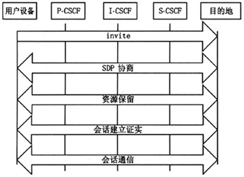 GPRS supporting node,GPRS服務(wù)支持節(jié)點)和GGSN(gateway GPRS supporting node,GPRS網(wǎng)關(guān)支持節(jié)點)到達(dá)CSCF,經(jīng)過處理后送往其他IMS網(wǎng)絡(luò)、MGCF/MGW網(wǎng)絡(luò)或外部IP網(wǎng)絡(luò)。在此過程中,SGSN和GGSN僅查看消息的目的IP地址,不分析消息的內(nèi)容,起到路由器的作用。圖6示出移動用戶發(fā)起呼叫的信令流程示例,此處假設(shè)用戶位于訪問網(wǎng)絡(luò)。用戶發(fā)SIP