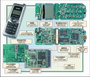 Wi-Fi功能由科勝訊(Conexant)的Prism3 802.11b芯片組完成,是一款傳統(tǒng)的專業(yè)方案?苿儆嵧ㄟ^收購GlobeSpan-Virata得到Prism3 802.11b,而GlobeSpan-Virata之前購買了Intersil的Wi-Fi芯片組業(yè)務(wù),所以Prism3組件仍打著Intersil的標(biāo)識。以目前的標(biāo)準(zhǔn)看,Prism3總體Wi-Fi方案的集成度不算太高。ISL3871基帶/媒體存取控制芯片與ISL3684收發(fā)器相連,一款獨(dú)立的壓控振蕩器和一個(gè)RF功放(ISL3084和ISL3984)共同支持ISL3684完成工作。適中的256KB SRAM和128KB閃存滿足該設(shè)計(jì)中802.11b部分對存儲器的需要。