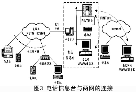 ---- 由 于PINT 業(yè) 務 主 要 是 以WWW 方 式 實 現(xiàn) 的, 因 此 電 話 信 息 臺 就 應 與ICP 合 作, 如 圖3, 在 兩 者 之 間 以 一 種 標 準 的 協(xié) 議 交 換 信 令 和 承 載 數(shù) 據(jù),PINT 協(xié) 議 正 是 一 種 很 合 適 的 協(xié) 議。 為 了 實 現(xiàn) 點 擊 撥 號、 點 擊 發(fā) 送 傳 真 等 業(yè) 務, 需 要 在WWW 服 務 器 的 頁 面 上 嵌 入 激 活 這 些 業(yè) 務 的 鏈 接 項, 鏈 接 項 對 應 的 后 臺 程 序 是 一 個PINT 客 戶 端 程 序(PINT Client),PINT 網(wǎng) 關 中 也 具 有PINT Client 的 功 能。PINT Client 包 含 了UAC 和UAS 的 功 能。 在 這 類 業(yè) 務 的 推 廣 初 期, 由 于PINT 網(wǎng) 關 較 少, 作 為WWW 服 務 器 后 臺 程 序 的PINT Client 可 直 接 與PINT 網(wǎng) 關 交 互。 當 業(yè) 務 使 用 規(guī) 模 進 一 步 擴 大 后 就 需 要 在Internet 中 設 置PINT Server, 各PINT Client 借 助 于 這 些PINT Server 來 找 到 一 個 合 適 的PINT 網(wǎng) 關。 如 果 電 話 信 息 臺 自 身 提 供 了ICP 的 功 能, 那 么 在 信 息 臺 內(nèi) 部 的 局 域 網(wǎng) 上 就 可 以 方 便 地 實 現(xiàn) 業(yè) 務。