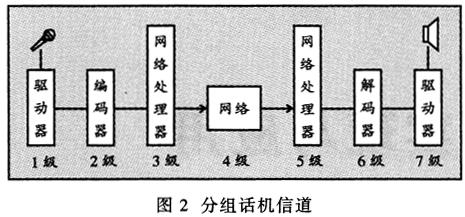 ——無論對于實時的應用(如IP電話)還是非實時的應用(如語音郵件),發(fā)送端語音都要經(jīng)過模擬信號—數(shù)字信號—語音包的處理過程,并在接收端對語音包進行相反的處理,從而得到與輸入端相同的語音信號。由圖2可見,每個語音流從信源(話筒)到信宿(揚聲器)就像通過一條管道,這條管道包括許多級,每一級代表一些特有的語音包處理過程。