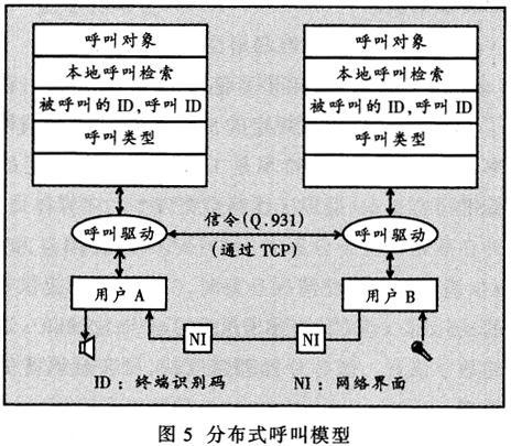 ——IP電話采用分布式的呼叫模式。因為不需要通過電路交換完成呼叫,所以每個終端都使用了呼叫處理器。單工呼叫模式僅支持一個終端的呼叫,且需要本地呼叫驅動的支持。通過觸發(fā)本地呼叫驅動軟件建立一次呼叫,而呼叫驅動利用傳輸控制協(xié)議(TCP)的套接字(Socket)與另一端的呼叫驅動建立信令連接,從而觸發(fā)另一端的單工呼叫。這兩個單工呼叫被觸發(fā)后按照Q.931信令協(xié)議完成呼叫過程的建立。根據(jù)信令的引導,呼叫驅動程序啟動語音信息流接入網(wǎng)絡和對端的接收設備,建立一個完整的呼叫過程(圖5)。圖5中的呼叫對象指明本次呼叫的域名、兩端的終端識別碼(ID)或電話號碼、呼叫類型(如單純語音、語音和數(shù)據(jù))等信息。