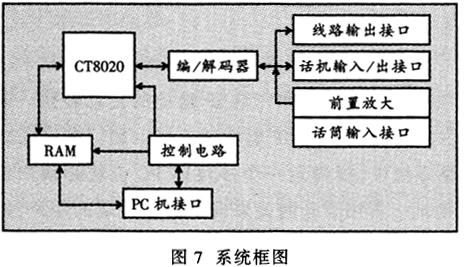 ——硬件平臺構造于PC機上,采用ISA總線插卡方式,如圖7所示。該平臺采用了美國DSPG公司的專用數(shù)字信號處理器CT8020作為核心部件,利用先進的可編程邏輯器件開發(fā)了外圍控制電路和接口電路。它主要完成以下功能。