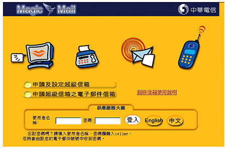 使用Internet瀏覽器的用戶可以通過中華電信超級信箱的專用網(wǎng)頁來接入。當然,您需要輸入使用名和密碼。