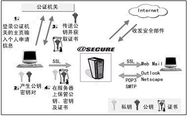 簡(jiǎn)單來(lái)說(shuō),PKI就是由發(fā)布機(jī)構(gòu)發(fā)布證書給PKI的用戶,證書中含有用戶公共密鑰和個(gè)人密鑰的信息,由證書、證書授權(quán)機(jī)構(gòu)CA和實(shí)體三部分組成。PKI的用戶利用個(gè)人密鑰簽發(fā)信息或解密收到的信息,而其他用戶則使用對(duì)應(yīng)公共密鑰收發(fā)信息;赑KI的設(shè)計(jì),采用統(tǒng)一的證書分配、管理策略以及共同的可靠性驗(yàn)證機(jī)制,一方面可以保證E-mail的安全性,另一方面還可以解決現(xiàn)有不同系統(tǒng)無(wú)法進(jìn)行通信的弊病。因此,現(xiàn)有推出的一些優(yōu)秀E-mail系統(tǒng)如3R Soft推出的@SECURE都是基于PKI進(jìn)行設(shè)計(jì)的。通過(guò)數(shù)據(jù)加密的辦法只能保證郵件的機(jī)密性,卻無(wú)法完全保證郵件的完整性和不可抵賴性,即不能保證郵件在傳輸過(guò)程中不被他人篡改,且不被人冒名頂替發(fā)送。數(shù)字簽名可以有效地阻止這一現(xiàn)象,即在發(fā)送E-mail的同時(shí),加上一個(gè)Hash冗余信息。發(fā)送者使用Hash函數(shù)創(chuàng)建信息的摘要,作為信息數(shù)字指紋,然后用個(gè)人密鑰加密信息摘要,加密后的信息摘要就是數(shù)字指紋。目前較為常用的,如在 @SECURE 中采用的MD5算法,它是一種單向散列算法,大小為128比特,經(jīng)計(jì)算,它被仿制的概率小于1/265,符合安全性的需要。