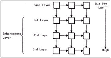 關(guān)于分層可擴(kuò)展性編碼的研究可以追溯到10年前,目前它已經(jīng)被許多現(xiàn)行的國(guó)際壓縮標(biāo)準(zhǔn)接納,例如H.263+和MPEG-4。分層可擴(kuò)展編碼主要有三種:時(shí)域可擴(kuò)展性、空域可擴(kuò)展性和質(zhì)量可擴(kuò)展性。其中質(zhì)量可擴(kuò)展性也稱為PSNR可擴(kuò)展性,原因是視頻質(zhì)量通常用峰值信噪比(PSNR)來(lái)衡量。