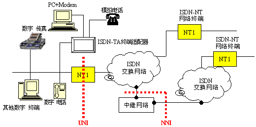 ISDN概念中的業(yè)務綜合的核心是從用戶端出發(fā),建立了一套標準的用戶和網絡接口協(xié)議體系(UNI:User-Network Interface)。同時給出了各ISDN網絡間互聯(lián)的NNI接口。這樣,非常簡單的統(tǒng)一了開發(fā)標準,提供了一個廠商間開放的競爭環(huán)境。見下圖。