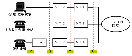 TA:終端適配器,完成非標準設備到ISDN速率的匹配及協(xié)議轉換(它可以在TE2中內嵌實現);以上各類設備間的連接接口稱為參考點(見下圖):