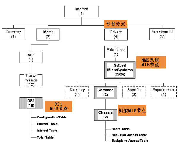下圖給出了NMS系統(tǒng)中SNMP可訪問(wèn)網(wǎng)絡(luò)設(shè)備的對(duì)象識(shí)別樹(shù)(OID:Object Identifier)結(jié)構(gòu)。