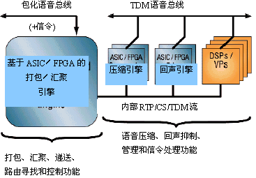 圖5畫出了這種技術(shù)實現(xiàn)的VoP系統(tǒng)框圖。圖中專用ASIC/FPGA引擎提供打包、匯聚、壓縮和回聲抑制功能。而DSP則用于信令功能,如音頻信號的接收和生成,DSP還用于開發(fā)商自定義功能。
