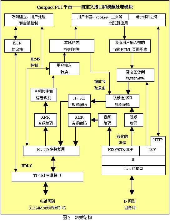 圖3所示為網(wǎng)關(guān)重要組成的分解圖。網(wǎng)關(guān)機(jī)箱很可能是一個(gè)Compact PCI機(jī)箱,機(jī)箱中包含了作為網(wǎng)絡(luò)中一個(gè)節(jié)點(diǎn)的所有組件;镜囊曨l呼叫和瀏覽器應(yīng)用可以運(yùn)行在主處理器上,但T1或E1接口需要由附加模塊來支持。為了支持大量的端口,還需要附加的以太網(wǎng)接口和自定義的視頻處理模塊。T1/E1接口通過公共電話網(wǎng)接入無線交換中心,也可以直接接入到無線交換中心。以太網(wǎng)接口會(huì)通過標(biāo)準(zhǔn)IP路由器接入到因特網(wǎng)。