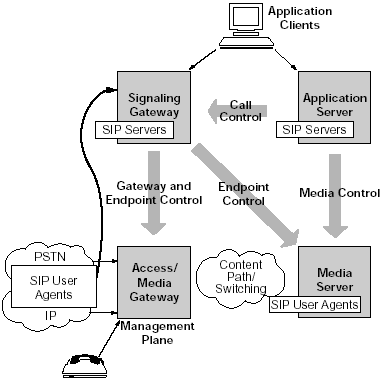 許多語音服務都是由媒體服務器提供的。例如,一個客戶給某個電子商務網站打電話會被接到一個自動語音應答(IVR)上或者自動總機上。這些應用使用了語音,語音識別和音頻等功能,都是運行在媒體服務器上的。在下一代網絡的實現(xiàn)中,媒體服務器就象是另一個電話(或者說,一個SIP的終端)。因此,他們可以享受和用戶一樣的SIP的優(yōu)點。