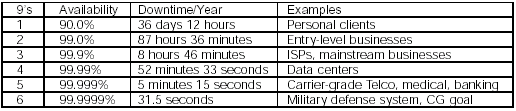 正如表中建議的那樣,實用性尤其在非常接近1的區(qū)間內(nèi)才被討論。盡管99%的正常運行時間看起來很好,它仍然將導致每年超過3天半的故障時間。大部分方案不會被認為是高可用的,直到它們接近99.9%的運行時間--大概每年9個小時的故障時間。但是,通信行業(yè)使用4個9級別到5個9級別范圍的實用性。