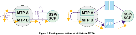 當(dāng)連接到MTP A或連接到 MTP B的鏈路發(fā)生故障時(shí),消息發(fā)送通過MTP A和MTP B之間的鏈路發(fā)送到另一個(gè)MTP,并在可用的鏈路上發(fā)送,如圖3。