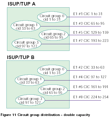 兩個系統(tǒng)中的電路組既可以從0開始編號,也可以兩個系統(tǒng)間隔標號。如果使用第一種方法,整個系統(tǒng)的容量就是單ISUP/TUP協(xié)議層系統(tǒng)的容量的2倍,如果使用第二種方法,系統(tǒng)總?cè)萘颗c單ISUP/TUP協(xié)議層系統(tǒng)的容量相同。對于這兩種情況,每半部分控制對立的CIC范圍,如圖11和12所示: