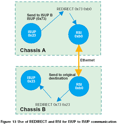 例如,一個雙ISUP系統(tǒng)應(yīng)該由兩個ISUP部分組成,每個缺省module_id都為0x23。A方ISUP的設(shè)置數(shù)據(jù)表示另一個ISUP部分的module_id為0x73。因此,在A方將會有一個重定向的動作來對經(jīng)過RSI發(fā)送往0x73的任何消息重新定向,在B方,應(yīng)該有一個REDIRECT語句將B方RSI所接收的所有目標為0x73的消息路由到本地ISUP。標識為0x23。如圖13所示。